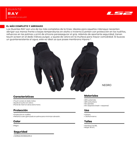 GAONA MOTOS INDUMENTARIA Y ACCESORIOS ------------------------------------------ GUANTE RAY: Es un guante ligero ideal para uso urbano, con protecciones en los nudillos, refuerzo en palma para minimizar la abrasión y ajuste de velcro en muñeca para que tengas la mayor comodidad y protección. Además, el touch screen permite que utilices el celular, sin necesidad de quitártelos. Es por este motivo que son los guantes ideales para aquellas personas que pasan mucho tiempo arriba de su moto. ------------------------------------------ Contamos con local a la calle en el barrio de Flores, Capital Federal. Por la zona de Av. Gaona y Av. Nazca. Nuestros horarios de atención son de Lunes a Viernes de 10:00 a 18:00. Sábados de 10:00 a 14:00. DOMINGOS Y FERIADOS CERRADO. ------------------------------------------ FORMAS DE ENVÍO: -Mercado envíos a todo el país (excepto Tierra del Fuego) -Motomensajeria (CABA y zonas de GBA) ------------------------------------------ FORMAS DE PAGO: Podés