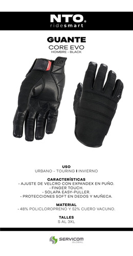 GAONA MOTOS INDUMENTARIA Y ACCESORIOS ------------------------------------------ Guantes Moto Invierno Nto Core Evo Negro Guante Core de Invierno compatible con pantallas táctiles. Confeccionado en neoprene con protecciones suaves en nudillos y palma en cuero. Recomendación de uso: Ciudad en bajas temperaturas. Cod. INTO41010102 ------------------------------------------ Contamos con local a la calle en el barrio de Flores, Capital Federal. Por la zona de Av. Gaona y Av. Nazca. Nuestros horarios de atención son de Lunes a Viernes de 10:00 a 18:00. Sábados de 10:00 a 14:00. DOMINGOS Y FERIADOS CERRADO. ------------------------------------------ FORMAS DE ENVÍO: -Mercado envíos a todo el país (excepto Tierra del Fuego) -Motomensajeria (CABA y zonas de GBA) ------------------------------------------ FORMAS DE PAGO: Podés pagar a través de mercado pago con tarjeta de crédito al instante o en efectivo generando un cupón de pago y luego dirigiéndote al centro de pago de tu prefer